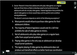3. Doctor: Research shows that adolescents who play video games on a regular basis are three times as likely to develop carpal tunnel syndrome as are adolescents who do not play video games. Federal legislation that prohibits the sale of video games to minors would help curb this painful wrist condition among adolescents. The doctor’s conclusion depends on which of the following assumptions?